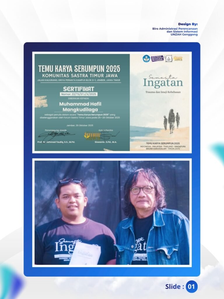 Mahasiswa Pascasarjana Universitas Islam Zainul Hasan Genggong (UNZAH Genggong) kembali menorehkan prestasi membanggakan di tingkat internasional. Muhammad Hafil Mangkudilaga, mahasiswa Magister Pendidikan Agama Islam (PAI), berhasil lolos kurasi Antologi Puisi Temu Karya Serumpun 2025 yang diikuti penyair dari berbagai negara Asia Tenggara.