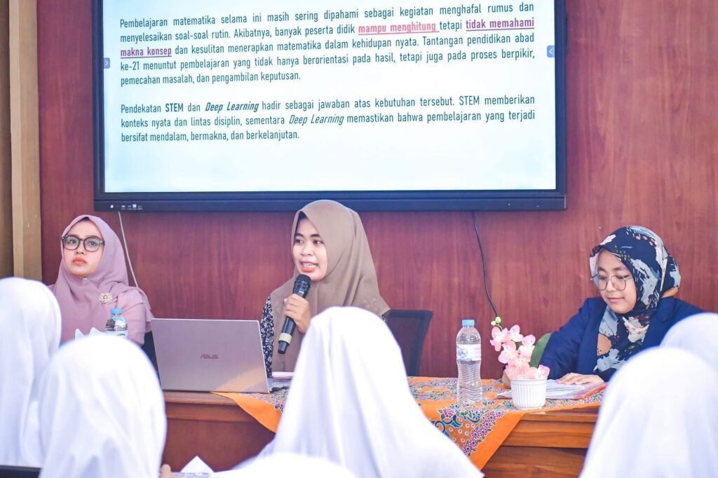 Pada rangkaian acara tersebut, Dr. Wahyu Lestari dipercaya sebagai narasumber dalam Workshop Pembelajaran Matematika di Era Abad ke-21 dengan tema “Integrasi Media, STEM, dan Deep Learning”. Workshop ini bertujuan untuk meningkatkan kapasitas dosen dalam merancang dan mengimplementasikan pembelajaran matematika yang lebih inovatif dan adaptif terhadap kebutuhan abad ke-21. STEM (Science, Technology, Engineering, and Mathematics) dan deep learning dipandang sebagai pendekatan yang sangat relevan untuk meningkatkan kualitas pendidikan matematika.